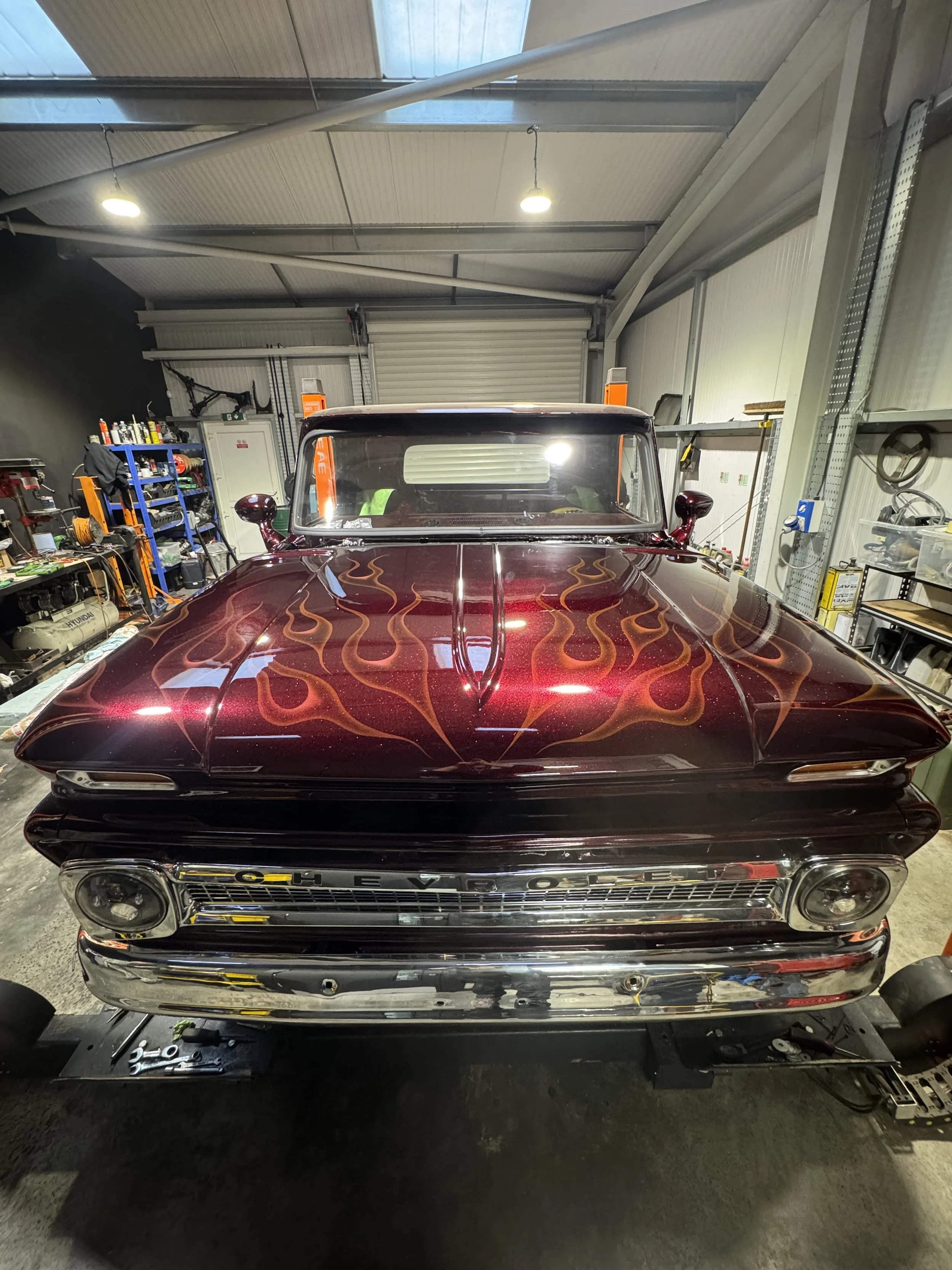 A bespoke valved exhaust system was fabricated to give the truck both a modern soundtrack and full driver-controlled personality. The rear bumper and wings were stretched to refine the body lines, adding subtle aggression without losing the C10’s classic silhouette.